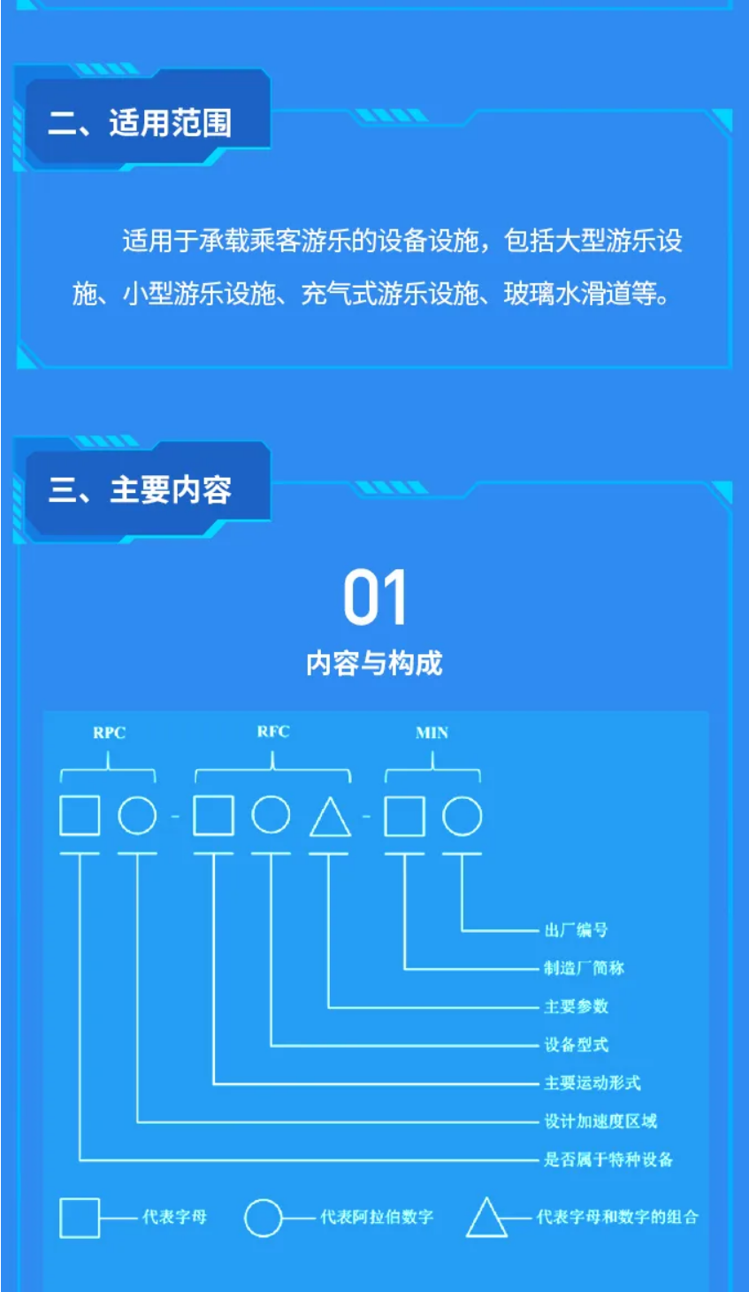 该标准是在2006年版的《游乐设施代号》基础上修订。适用于承载乘客游乐的设备设施,包括大型游乐设施、小型游乐设施、充气式游乐设施、玻璃水滑道等。修订后的标准充分考虑了游乐设施产品生产和安全监管的需求,形成了系统化代号体系,便于设计、制造、使用、检验单位和监督机构快速识别和管理,提升了行业规范化水平。