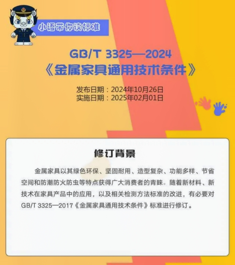 10月26日,国家市场监督管理总局(国家标准化管理委员会)修订发布《金属家具通用技术条件》(GB/T 3325—2024)推荐性国家标准,将于2025年2月1日正式实施。