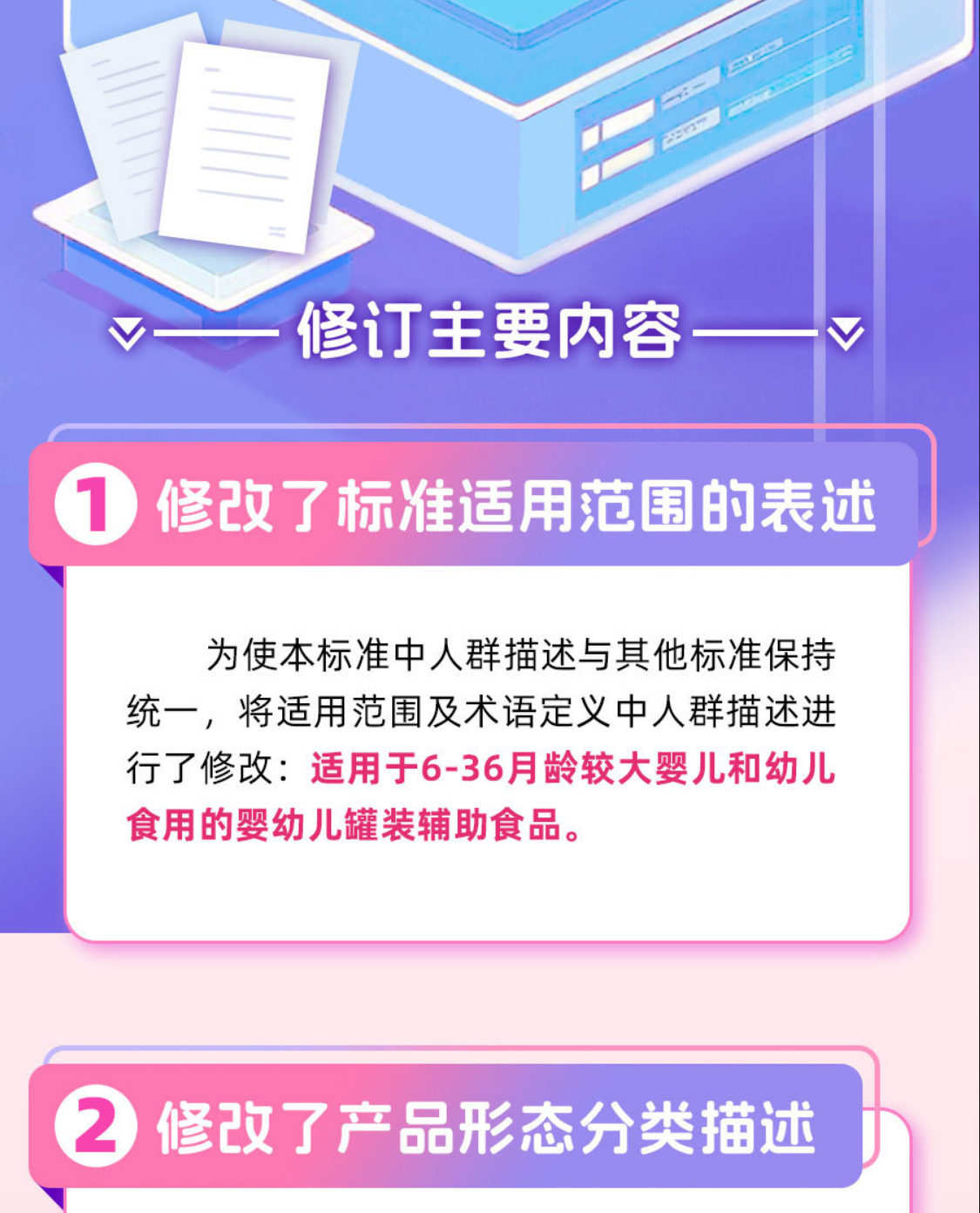 本次标准修订以保障婴幼儿营养和健康为核心原则,参照婴幼儿喂养指南,结合婴幼儿的生长发育特点和营养健康现状,同时借鉴国际组织及其他国家的标准管理经验,主要对产品类别和理化指标等进行了修订。
