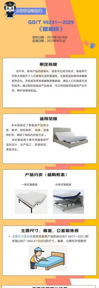 1月24日,国家市场监督管理总局(国家标准化管理委员会)发布《智能床》(GB/T 45231—2025)推荐性国家标准,将于2025年8月1日正式实施。
