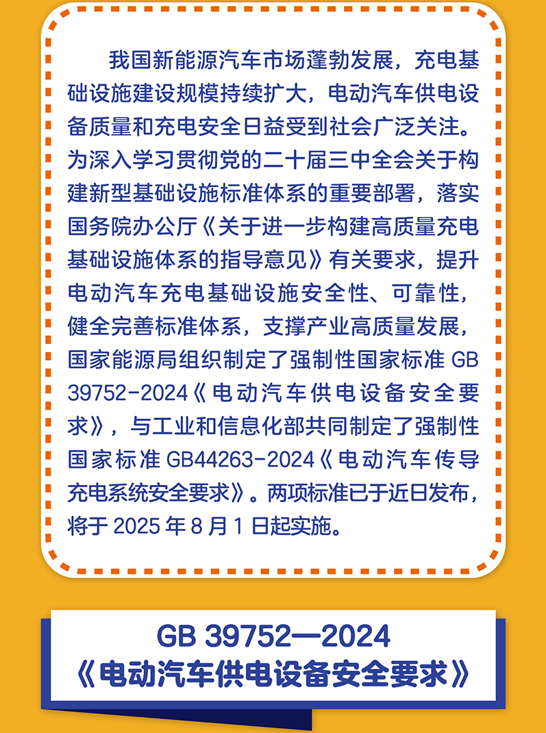 7月24日,国家市场监督管理总局(国家标准化管理委员会)批准发布《电动汽车供电设备安全要求》(GB 39752-2024)、《电动汽车传导充电系统安全要求》(GB 44263-2024)两项强制性国家标准,标准将于2025年8月1日正式实施。标准文本可在全国标准信息公共服务平台(https://std.samr.gov.cn/)和浙江标准在线(https://bz.zjamr.zj.gov.cn/)进行检索查阅。
