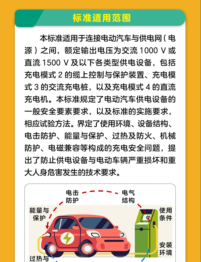《电动汽车供电设备安全要求》是在2021年版《电动汽车供电设备安全要求及试验规范》(GB/T 39752-2021)的基础上修订而成。新标准规定了电动汽车供电设备的一般安全要素要求,以及标准的实施要求,相应试验方法。界定了使用环境、设备结构、电击防护、能量与保护、过热及防火、机械防护、电磁兼容等构成的充电安全问题,提出了防止供电设备与电动车辆严重损坏和重大人身危害发生的技术要求。