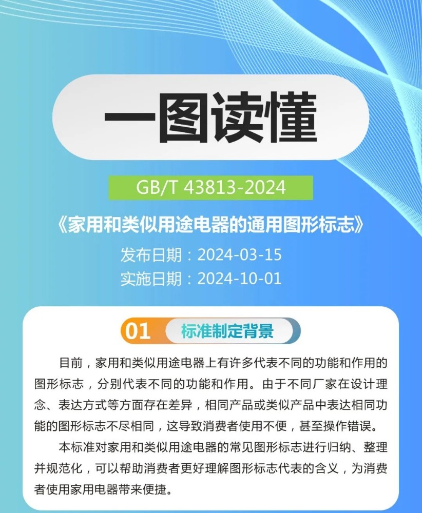 3月15日,国家市场监督管理总局(国家标准化管理委员会)批准发布《家用和类似用途电器的通用图形标志》(GB/T 43813-2024)推荐性国家标准,已于10月1日正式实施。标准文本可在全国标准信息公共服务平台(https://std.samr.gov.cn/)和浙江标准在线(https://bz.zjamr.zj.gov.cn/)进行检索查阅。