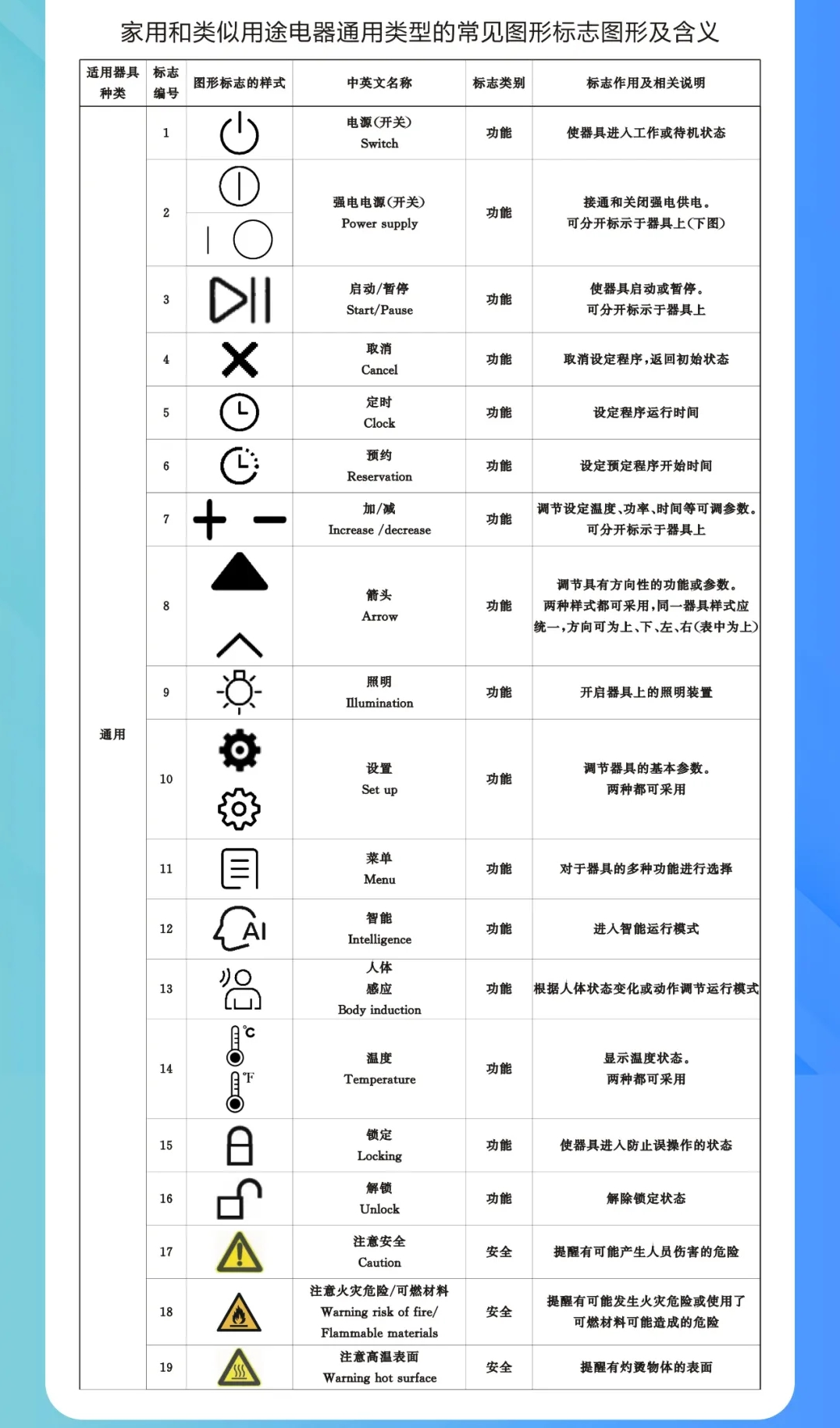 标准界定了家用和类似用途电器通用图形标志的术语、分类和符号并规定了图形标志的一般要求和设计要求,适用于家用和类似用途电器设计、生产、销售和检验。该标准的发布与实施可以帮助消费者更好理解图形标志代表的含义,使消费者更易于理解和接受,在方便消费者的同时促进行业的健康发展。