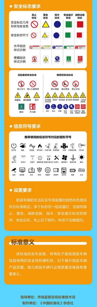 为规范旅居车辆设计、生产和使用,市场监管总局(国家标准委)组织制定了《旅居车辆 安全标志和信息符号》(GB/T46094—2025)国家标准,规定了旅居车辆配备的安全标志和信息符号,明确了各类标志和符号的形状、颜色、尺寸、布置等方面的技术要求,涵盖驾驶安全、生活起居、消防设施等多个方面。