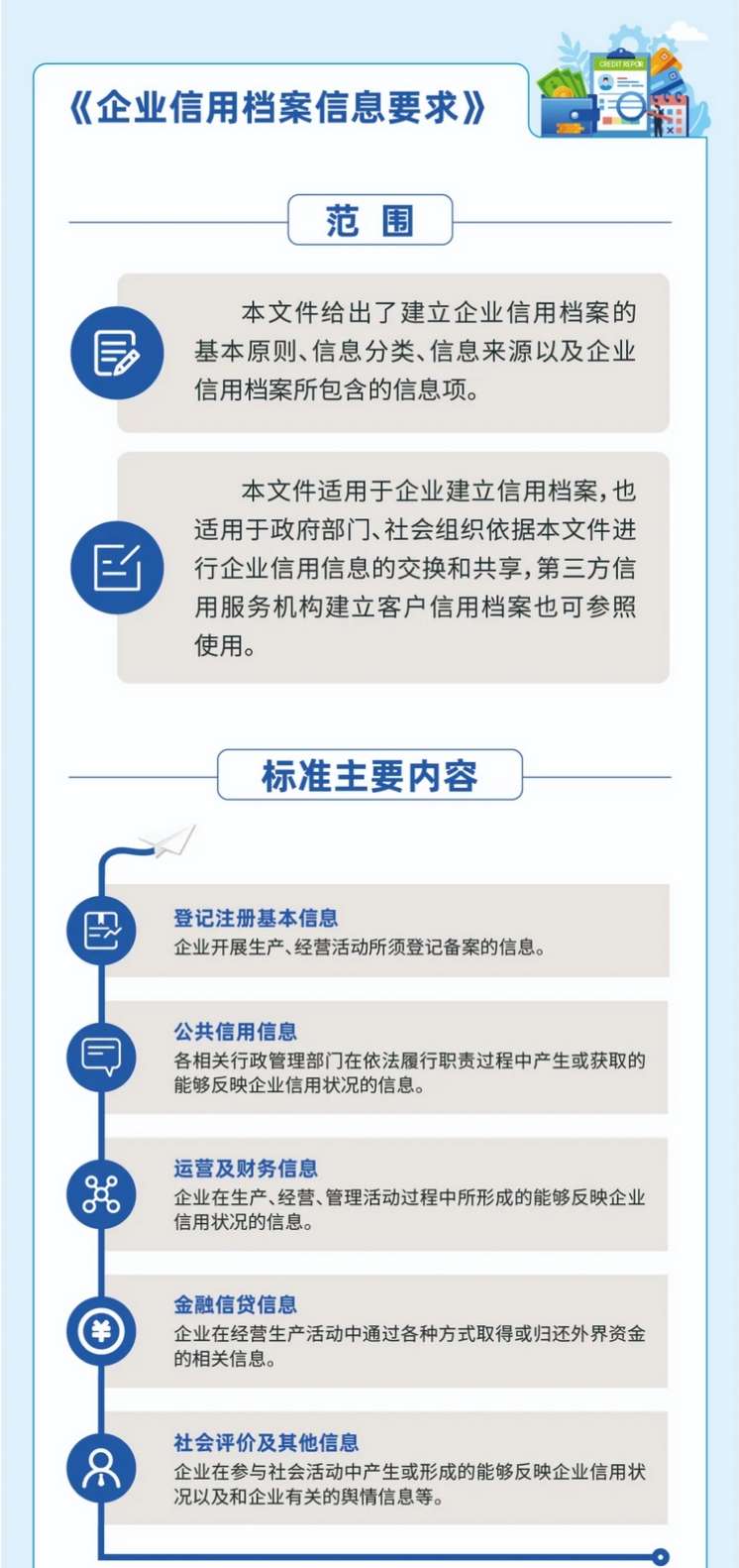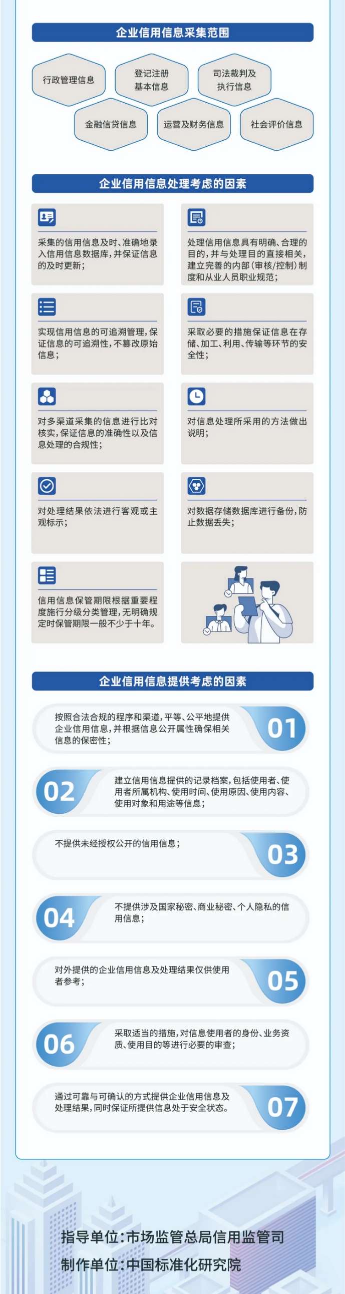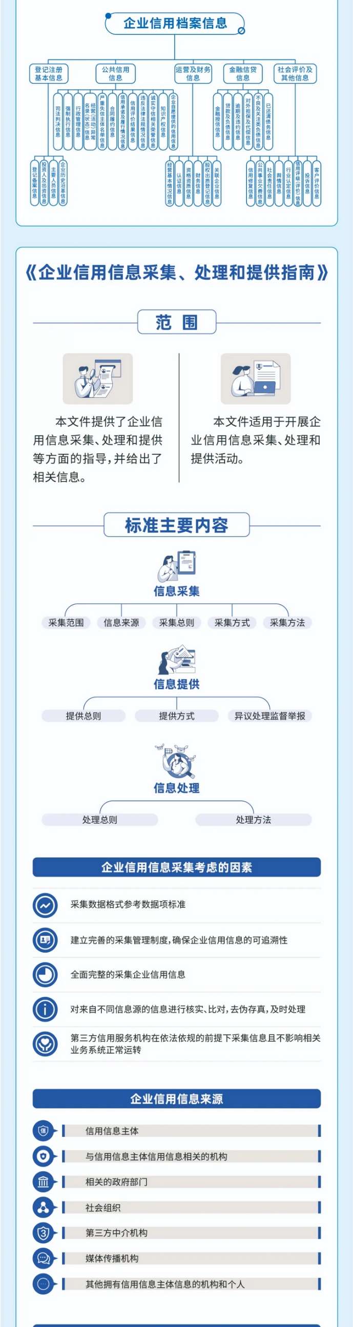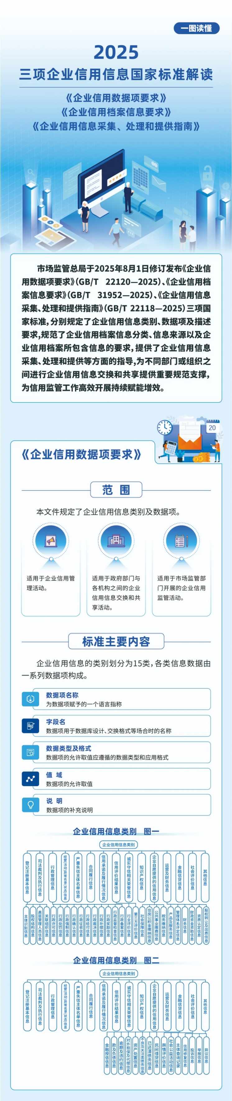 2025年8月1日市场监管总局修订发布《企业信用数据项要求》(GB/T 22120-2025)《企业信用档案信息要求》(GB/T 31952-2025)《企业信用信息采集、处理和提供指南》(GB/T 22118-2025)三项国家标准,分别规定了企业信用信息类别、数据项及描述要求,规范了企业信用档案信息分类、信息来源以及企业信用档案所包含信息的要求,提供了企业信用信息采集、处理和提供等方面的指导,为不同部门或组织之间进行企业信用信息交换和共享提供重要规范支撑为信用监管工作高效开展持续赋能增效。