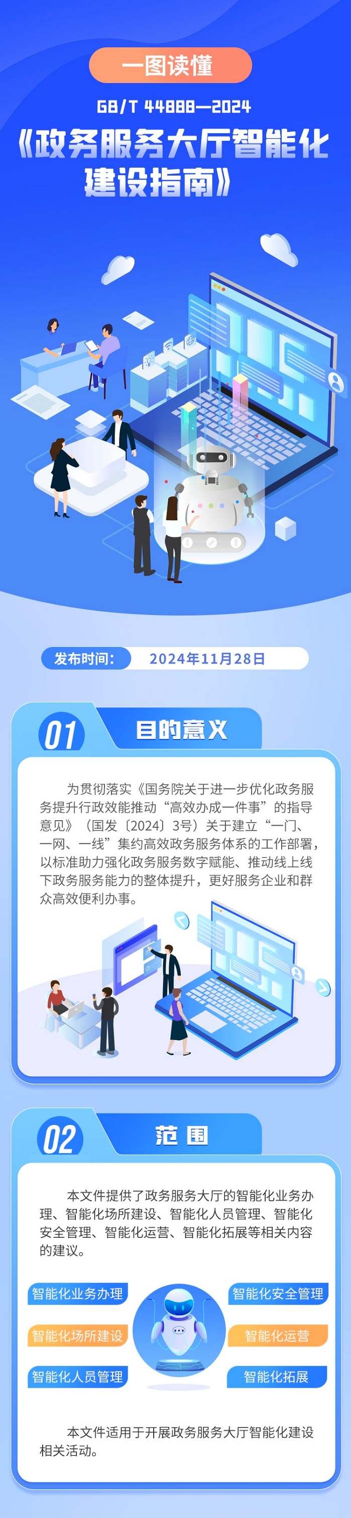 11月28日,国家市场监督管理总局(国家标准化管理委员会)制定发布《政务服务大厅智能化建设指南》(GB/T 44888—2024)推荐性国家标准,将于2025年12月1日正式实施。