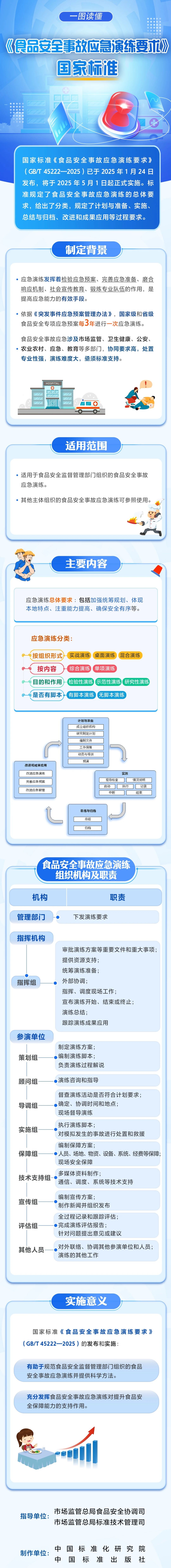 该标准的发布和实施,为市场监管、卫生健康、公安、农业农村、应急、教育等部门协同开展食品安全事故应急演练提供指导,有助于进一步规范应急演练流程,推动提升我国食品安全保障和应急处置能力,切实维护人民群众消费安全和社会稳定。