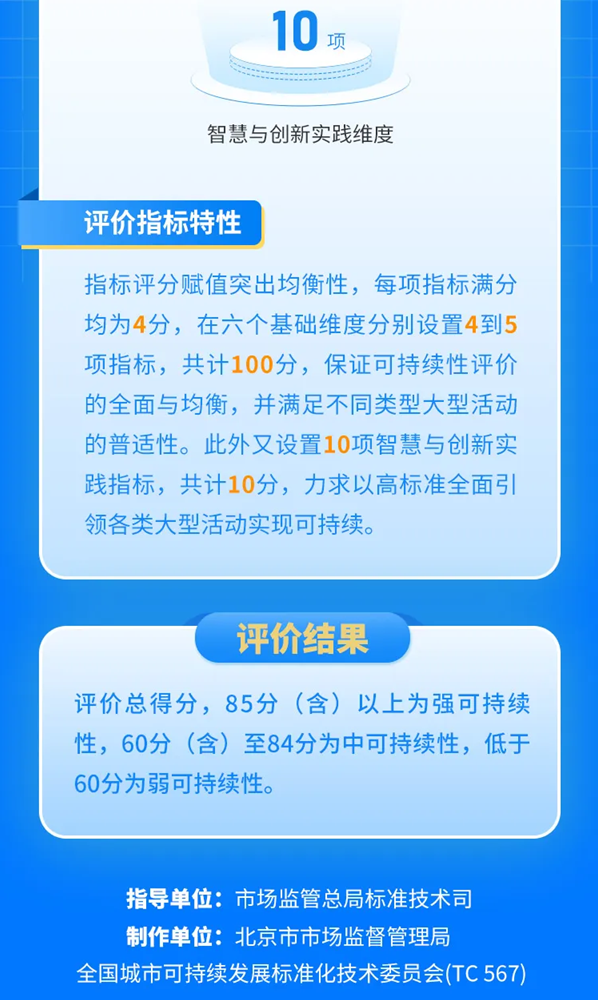 本标准着眼于绿色发展,对接联合国可持续发展目标(SDGs),围绕可持续性采购、碳中和、场地利用、生态修复和恢复等方面设置了7大类35项评价指标,重点关注大型活动的绿色低碳水平、对生态环境的保护、资源的合理利用以及社会责任承担。标准提供了科学的评价方法,将大型活动的可持续性分为强、中、弱三个等级,提出了指标分值计算、评价等级设定等,评价过程涵盖大型活动的申办、筹备和举办全过程。《大型活动可持续性评价指南》国家标准的发布实施,是落实联合国可持续发展目标的积极举措,有利于引导和促进我国城市和地区在组织大型活动时实现经济、社会和环境的协调发展,对推动实现城市可持续发展具有重要指导意义。