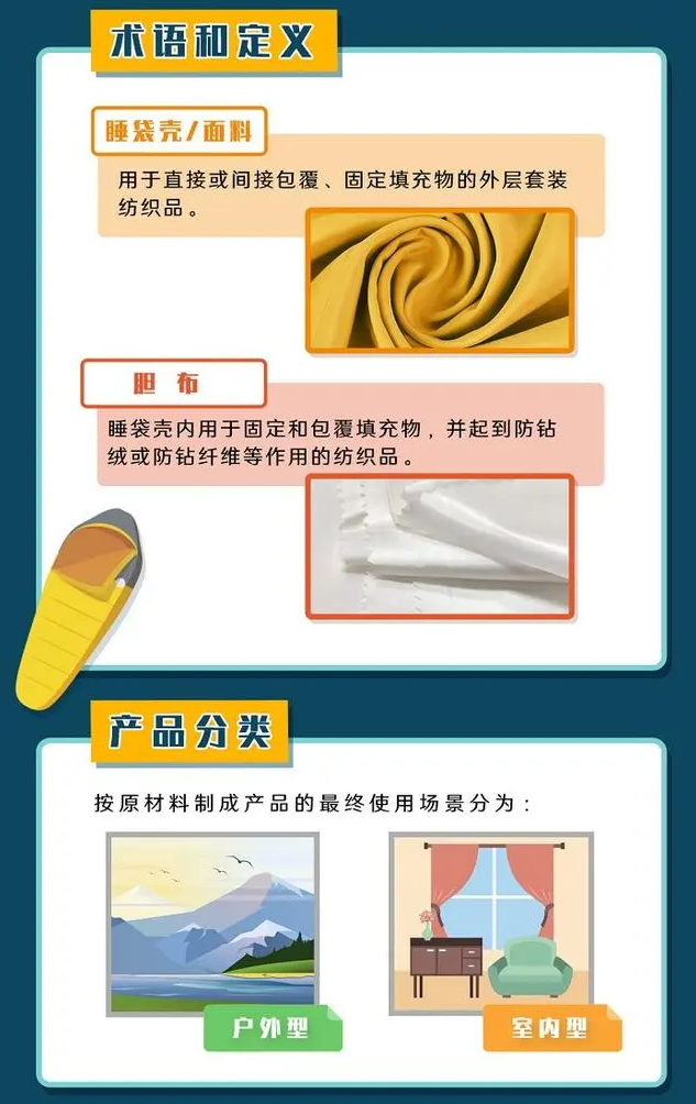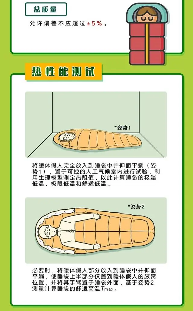 《睡袋的要求 第1部分》规定了睡袋热性能、尺寸和质量等指标的标签要求、技术要求和测试方法,描述了用于评价稳态条件下睡袋保暖性能的试验方法。《睡袋的要求 第2部分》基于睡袋保暖、舒适、便携,并在特殊使用环境下具备防水等性能的总体要求,对睡袋生产过程中所涉及的面料、里料、胆布、填充物等原材料提出了性能要求。