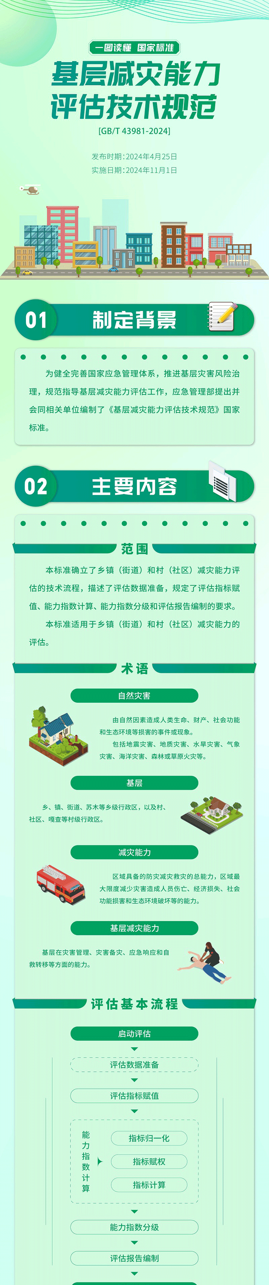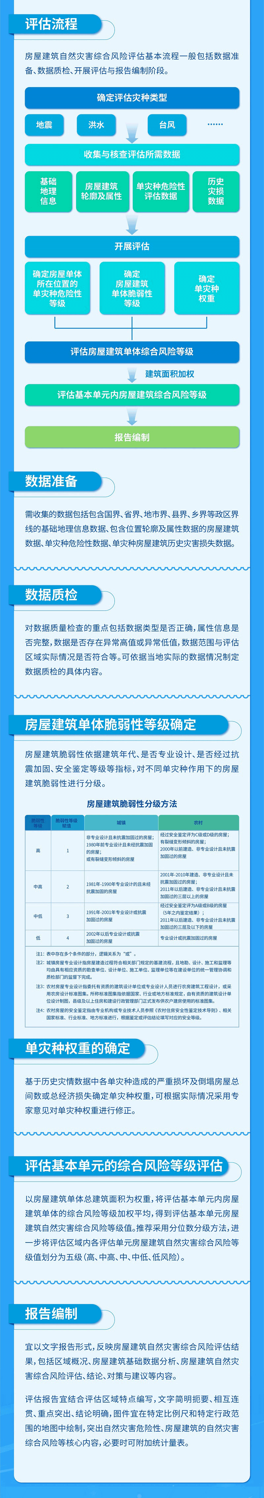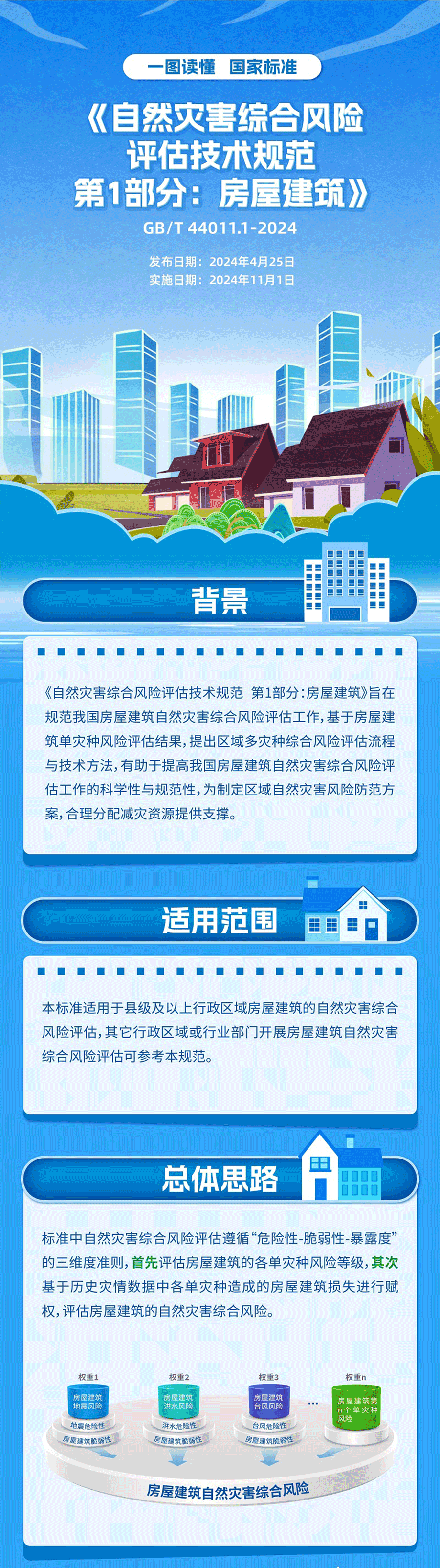 《自然灾害综合风险评估技术规范 第1部分:房屋建筑》规定了县级以上行政区域房屋建筑自然灾害综合风险评估的技术流程,规定了房屋建筑自然灾害综合风险评估的范围、对象、内容和基本单元,描述了评估数据准备与评估方法。该标准的发布实施,有助于提高我国房屋建筑综合风险评估工作的规范性和科学性,为房屋建筑风险治理工作提供技术支撑。
