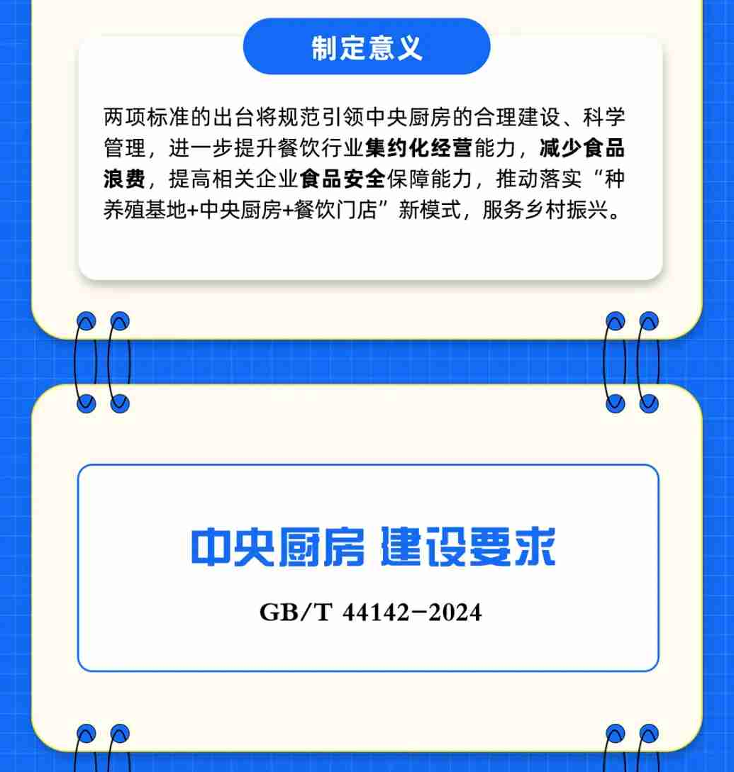 6月29日,国家市场监督管理总局(国家标准化管理委员会)发布了《中央厨房 建设要求》(GB/T 44142-2024)、《中央厨房 运营管理规范》(GB/T 44141-2024)两项推荐性国家标准。标准已于10月1日正式实施。
