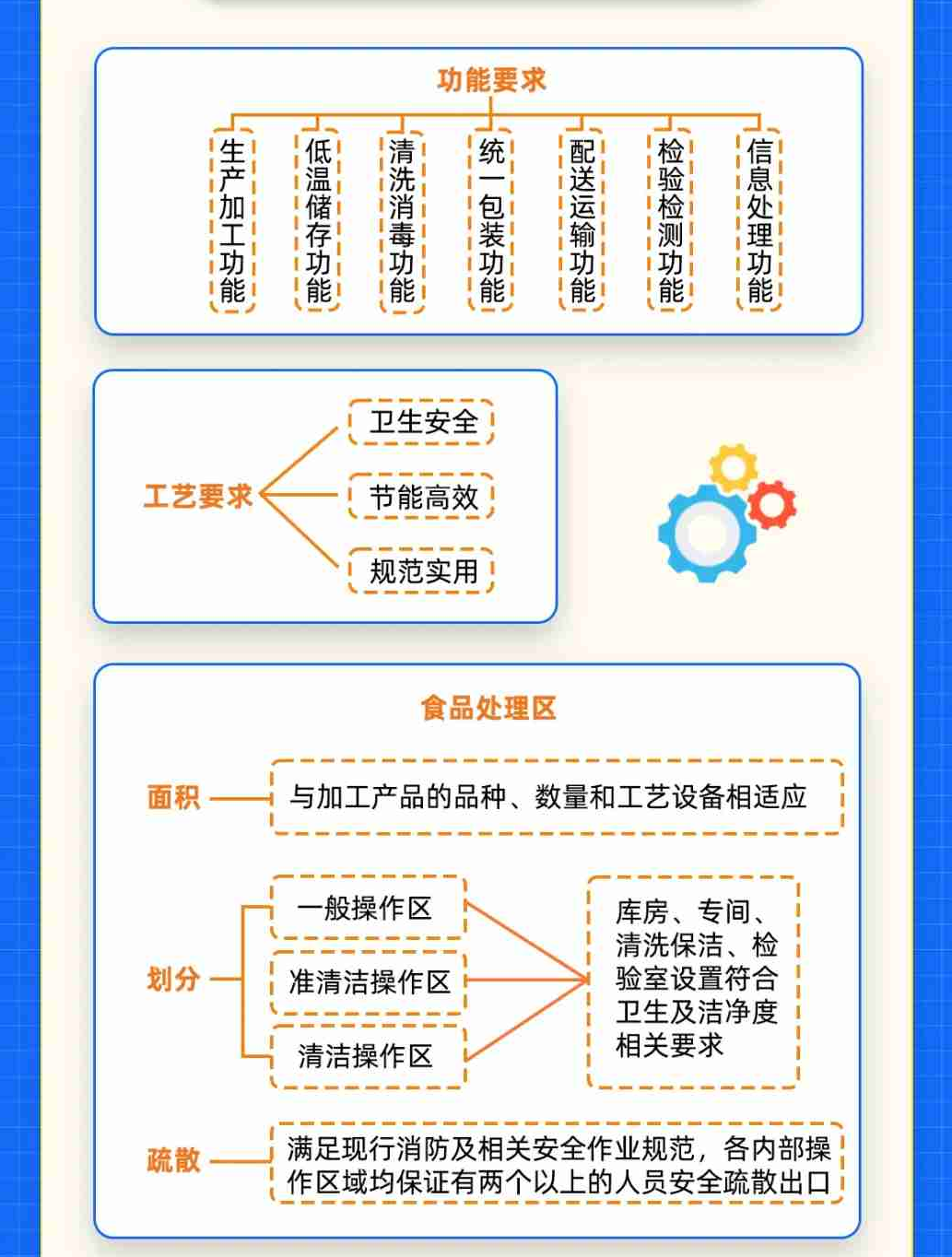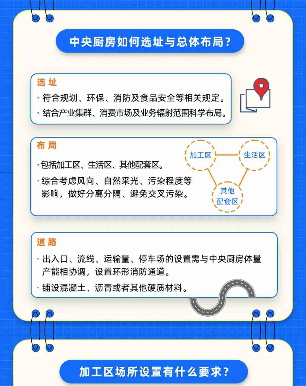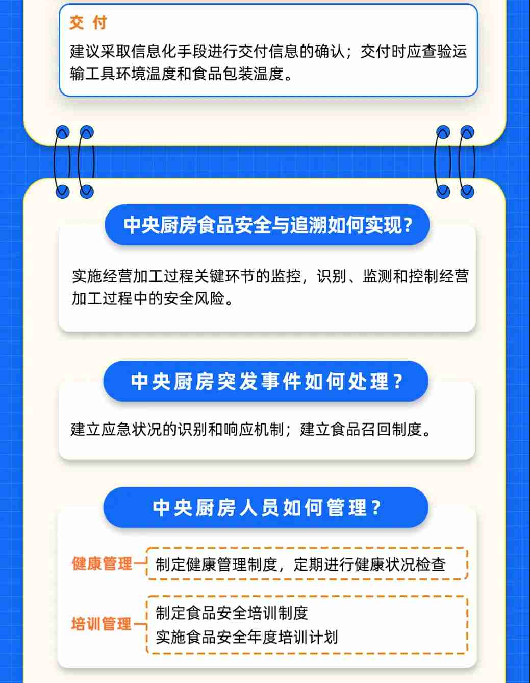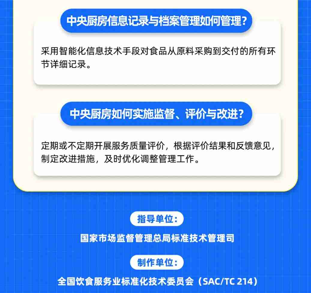 《中央厨房建设要求》给出了中央厨房选址与总体布局、加工区场所设置、主体建设、设施设备四个方面的要求,指导中央厨房合理建设、科学投资。《中央厨房 运营管理规范》则从设施设备管理、经营加工过程、安全与追溯、应急与召回、人员管理、信息记录与档案管理,以及监督、评价与改进等方面,为中央厨房的运营管理提供指导,并对原辅料采购与验收、经营加工、检验与留样、仓储、配送、交付等环节提出具体细化要求。