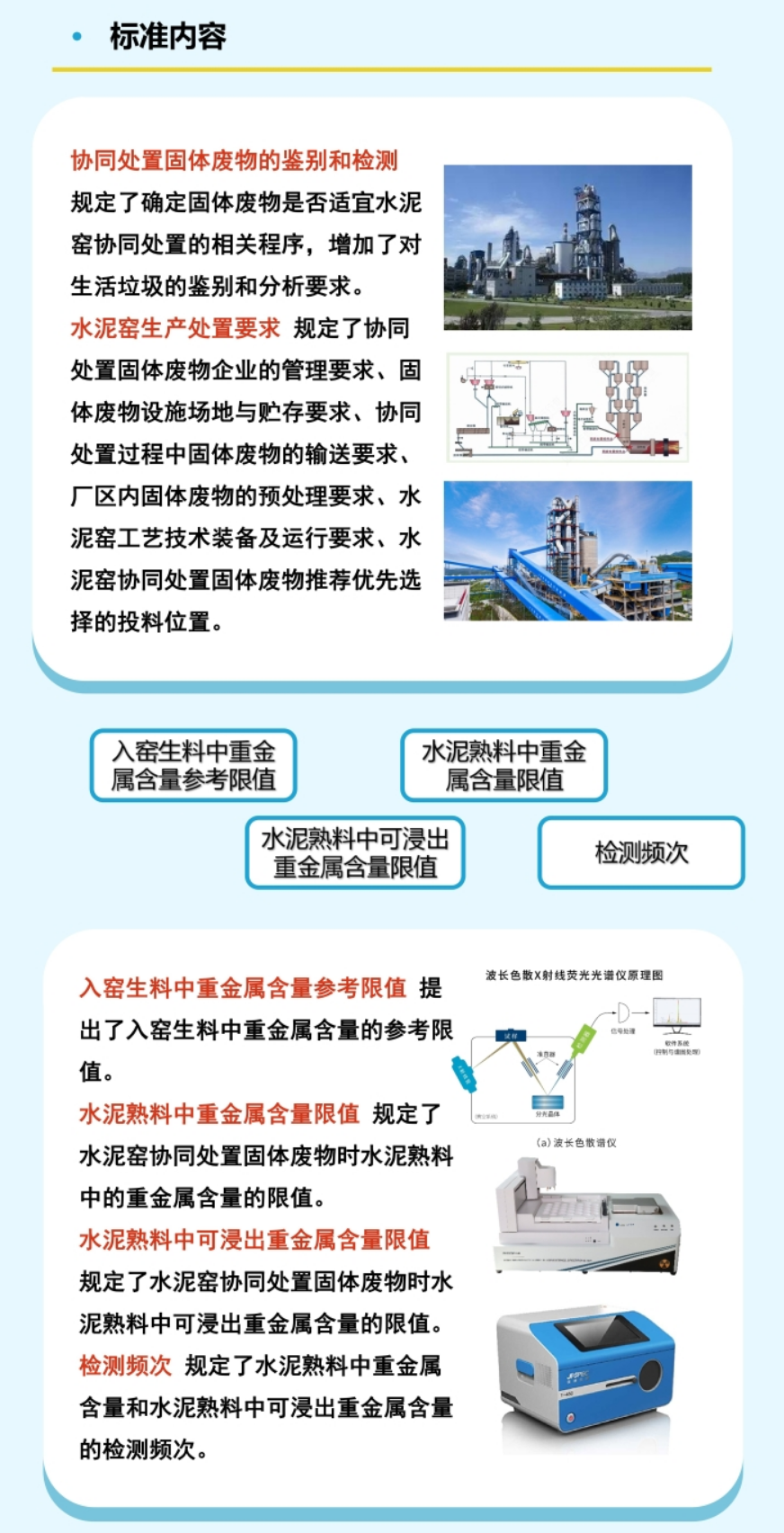 该标准在2014年版《水泥窑协同处置固体废物技术规范》的基础上进行修订。新版本从入窑生料中的重金属含量、水泥熟料中的重金属含量和水泥熟料中可浸出的重金属含量这三个方面,对水泥窑协同处置过程进行了规范化控制。同时,本标准中新增了重金属含量限值检测方法,便于水泥企业更便捷、准确、稳定的对固体废物进行测试,满足了不同固废的检测需求。本标准的发布和实施积极推动了水泥入窑生料和水泥熟料重金属快速测定,支持水泥企业做到“随时检测、随时处置”。