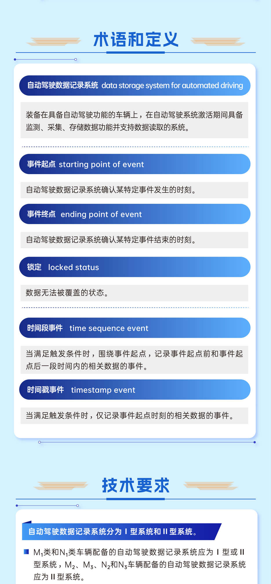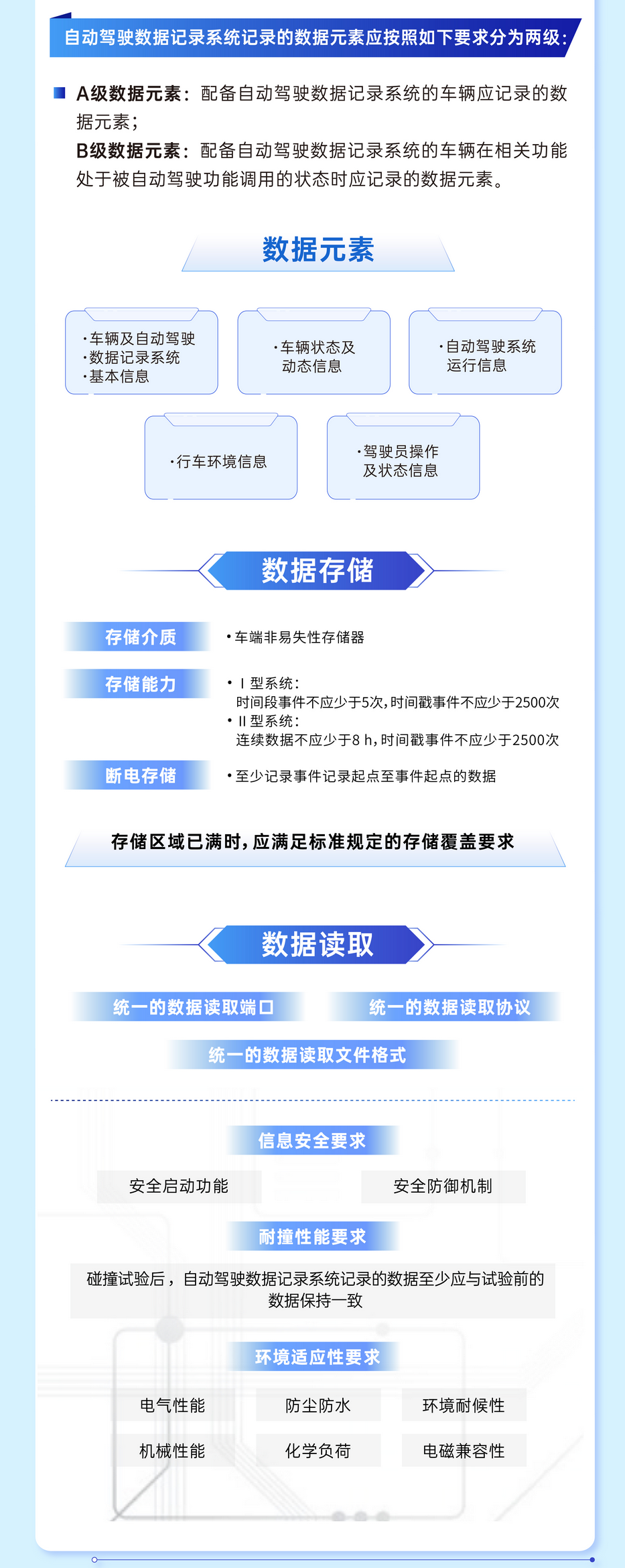 《智能网联汽车 自动驾驶数据记录系统》规定了智能网联汽车自动驾驶数据记录系统的技术要求试验方法、同一型式判定等。该标准的制定和实施,明确了智能网联汽车自动驾驶数据记录系统的技术要求和试验方法等,为行业管理提供数据支撑,为具备自动驾驶功能的智能网联汽车事故判责及原因分析提供技术依据。