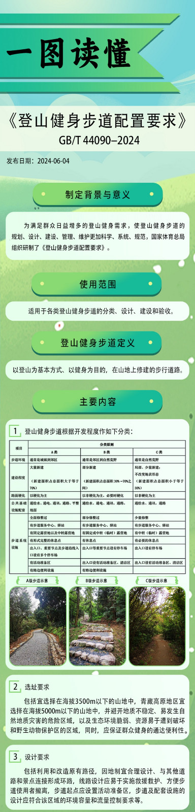 该标准根据充分考虑了群众的登山健身需求,为使登山健身步道的规划、设计、建设、管理、维护更加科学、系统、规范,提出了登山健身步道的分类原则、选址要求、设计要求、建设要求、环保系统要求、安全救援系统要求等。