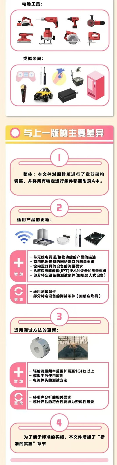 该标准在2018年版《家用电器、电动工具和类似器具的电磁兼容要求 第1部分:发射》的基础上进行修订。相较于旧标准,新版本对原排版进行了章节架构调整,新增了带无线电发送和接收功能的产品的描述,家用电器设备的网络端口、含内置灯具的设备、含感应电能传输(IPT)技术的设备的测量要求,部分特定设备的测试条件,更改了通用测试条件和部分特定设备的测试条件,并增加了“标准的实施”章节。