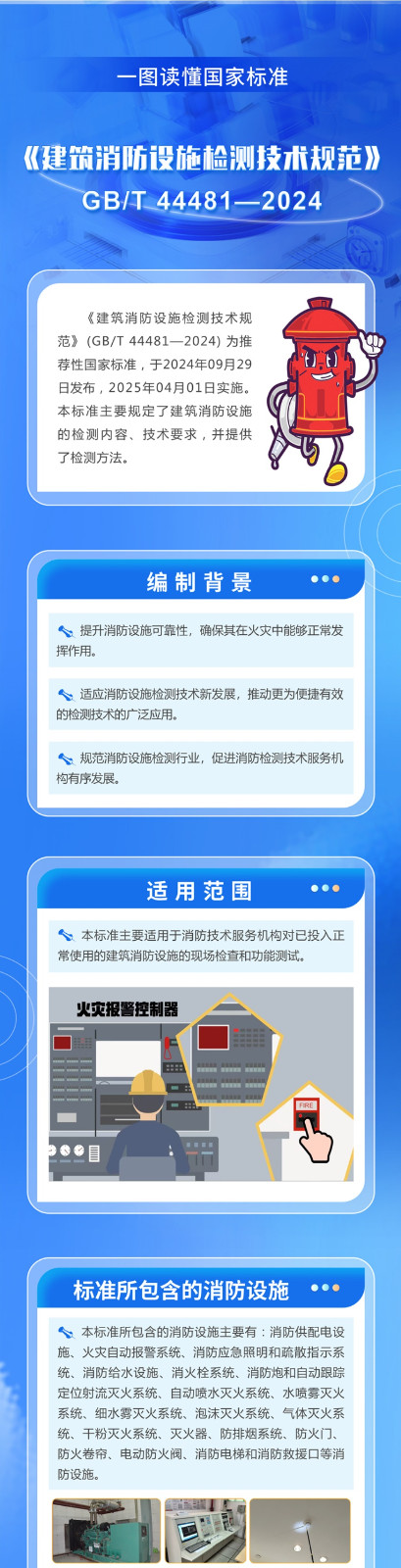 9月29日,国家市场监督管理总局(国家标准化管理委员会)批准发布《建筑消防设施检测技术规范》(GB/T 44481—2024)国家标准,将于2025年4月1日正式实施。