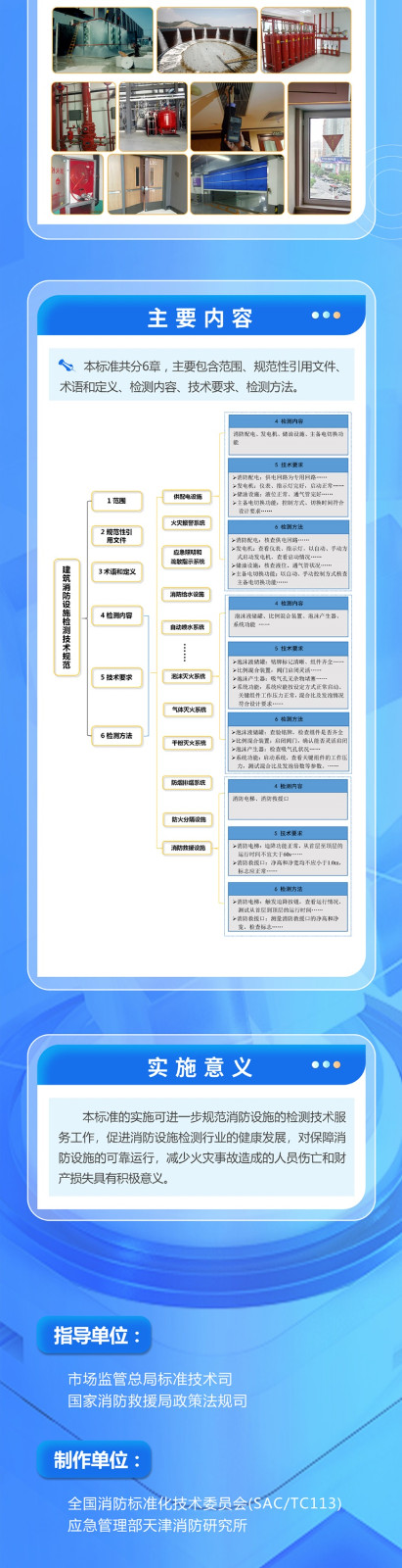 该标准主要规定了建筑消防设施的检测内容、技术要求,并提供了检测方法,主要适用于消防技术服务机构对已投入正常使用的建筑消防设施的现场检查和功能测试。该标准的发布和实施可进一步规范消防设施的检测技术服务工作,促进消防设施检测行业的健康发展,对保障消防设施的可靠运行,减少火灾事故造成的人员伤亡和财产损失具有积极意义。
