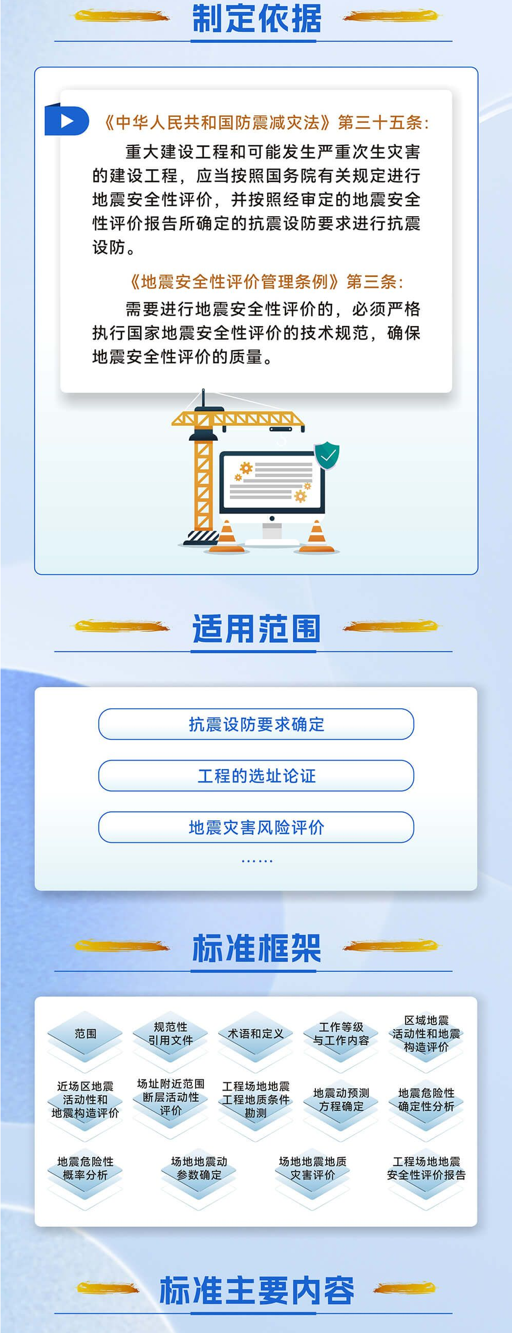 本标准对工程场地地震安全性评价的工作步骤、工作内容及其方法、报告编写等方面的技术要求作出规定,是开展工程场地地震安全性评价必须遵守的技术规范。该标准是在2005年版本基础上的修订,本次修订提升了地震安全性评价工作的科学性和可操作性。标准的实施为确保重大建设工程的地震安全,以及工程抗震设防要求监管提供了明确的技术依据。