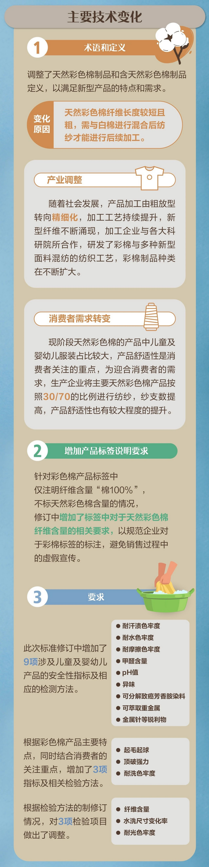 该标准是在2006版本标准的基础上修订而成,在术语和定义上,调整了天然彩色棉制品和含天然彩色棉制品定义,以满足新型产品的特点和需求;针对彩色棉产品标签中仅注明纤维含量“棉100%”不标天然彩色棉含量的情况,修订中增加了标签中对于天然彩色棉纤维含量的相关要求,以规范企业对于彩棉标签的标注,避免销售过程中的虚假宣传;此次标准修订中增加了9项涉及儿童及婴幼儿产品的安全性指标及相应的检测方法;根据彩色棉产品主要特点,同时结合消费者的关注重点,增加了3项指标及相关检验方法;根据检验方法的制修订情况,对3项检验项目做出了调整。