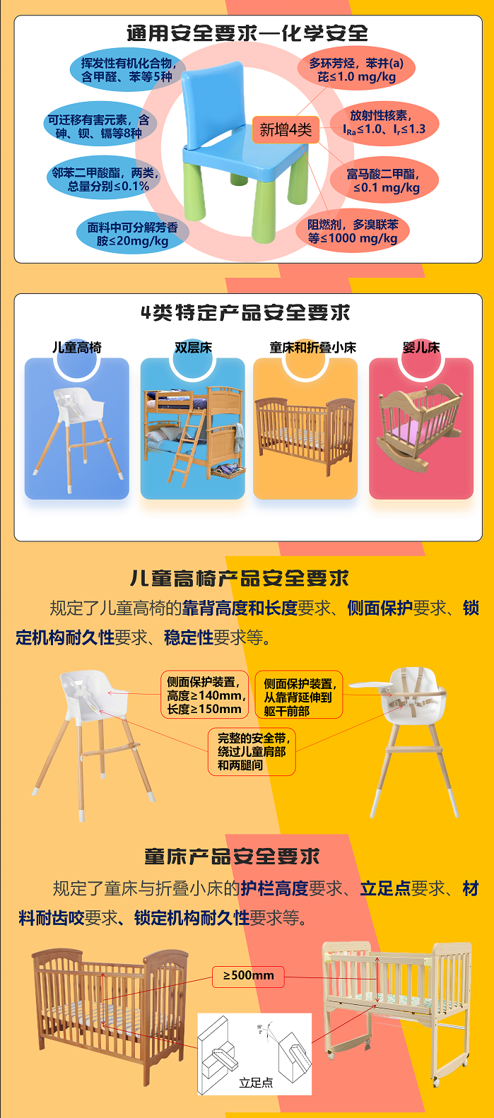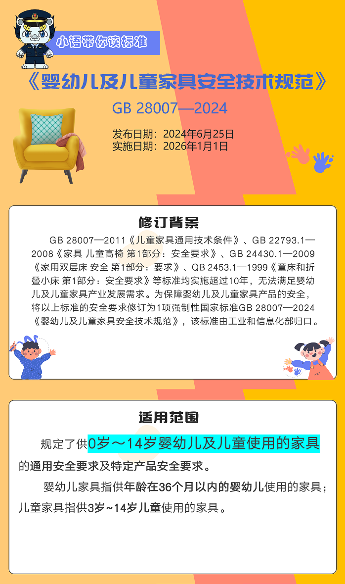该标准在《儿童家具通用技术条件》(GB28007-2011)、《家具 儿童高椅 第1部分:安全要求》(GB22793.1-2008)、《家用双层床 安全第1部分:要求》(GB24430.1-2009)等标准的基础上进行整合修订。新标准适用于所有0岁至14岁婴幼儿及儿童家具产品质量安全的管控,规定了材料、结构、阻燃性能、电气安全、有害物质限量、警示标识等通用安全要求,以及儿童高椅、双层床/高床、童床和折叠小床、婴儿床、软体家具等特定产品安全要求和相应的试验验证方法。