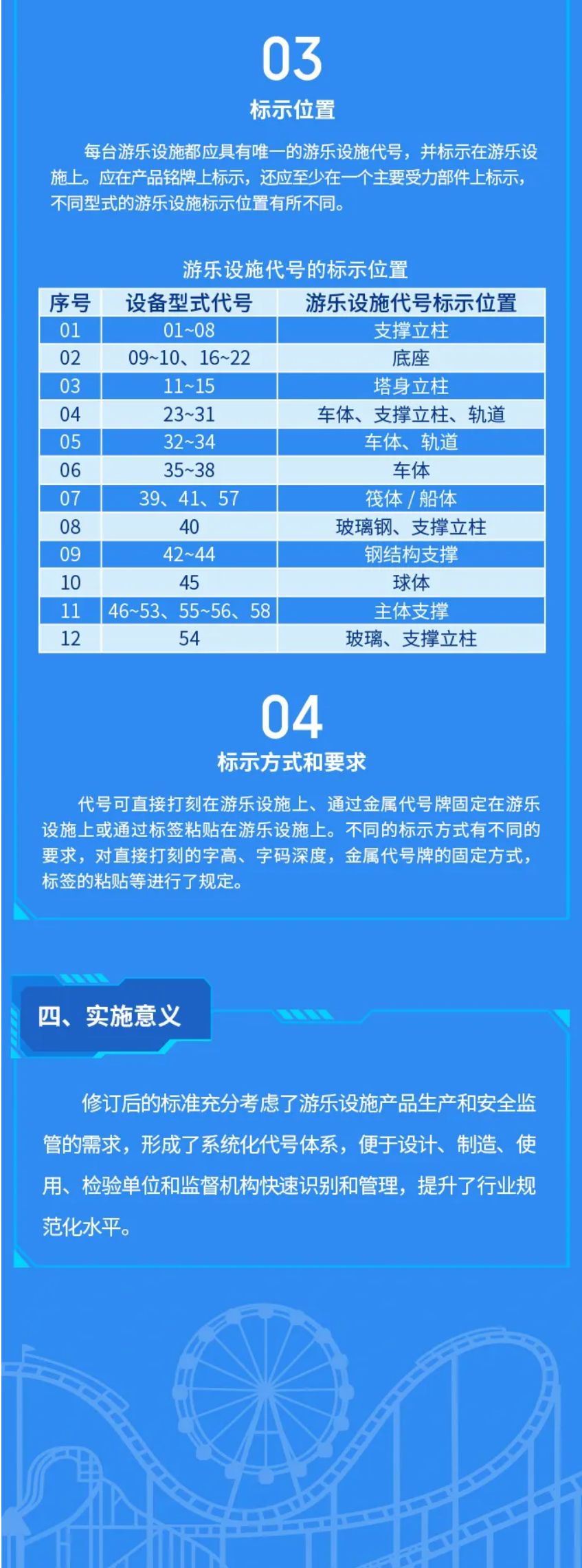 该标准是在2006年版的《游乐设施代号》基础上修订。适用于承载乘客游乐的设备设施,包括大型游乐设施、小型游乐设施、充气式游乐设施、玻璃水滑道等。修订后的标准充分考虑了游乐设施产品生产和安全监管的需求,形成了系统化代号体系,便于设计、制造、使用、检验单位和监督机构快速识别和管理,提升了行业规范化水平。