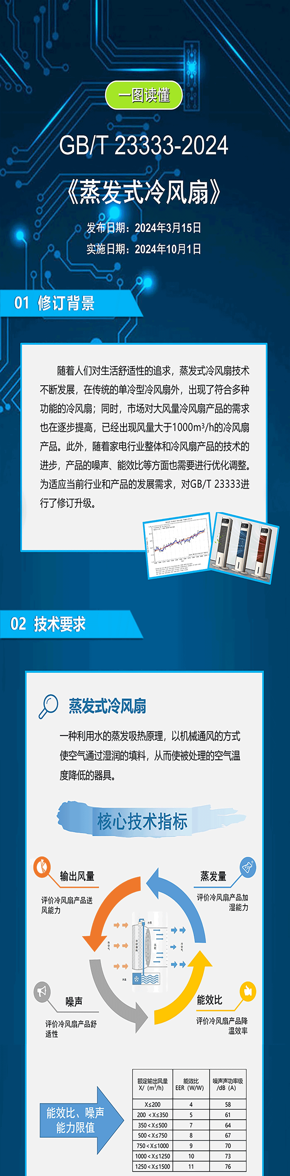 近日,国家市场监督管理总局(国家标准化管理委员会)发布了《蒸发式冷风扇》(GB/T 23333-2024)国家标准。该标准为推荐性标准,在原《蒸发式冷风扇》(GB/T 23333-2009)的标准基础上修订,将于2024年10月1日开始实施。