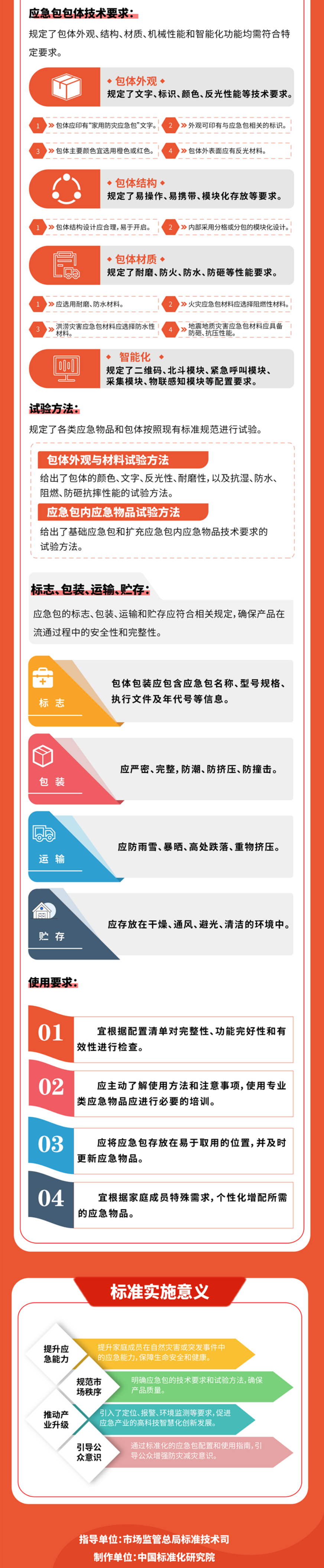 该标准规定了家用防灾应急包的分类、功能、应急物品配置、技术要求和试验方法等内容。适用于家用防灾应急包的生产、配置和使用,其他场景应急包可参照使用。有利于提升家庭成员在自然灾害或突发事件中的应急能力,保障生命安全和健康。