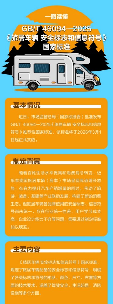 为规范旅居车辆设计、生产和使用,市场监管总局(国家标准委)组织制定了《旅居车辆 安全标志和信息符号》(GB/T46094—2025)国家标准,规定了旅居车辆配备的安全标志和信息符号,明确了各类标志和符号的形状、颜色、尺寸、布置等方面的技术要求,涵盖驾驶安全、生活起居、消防设施等多个方面。