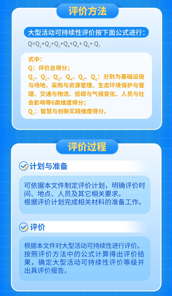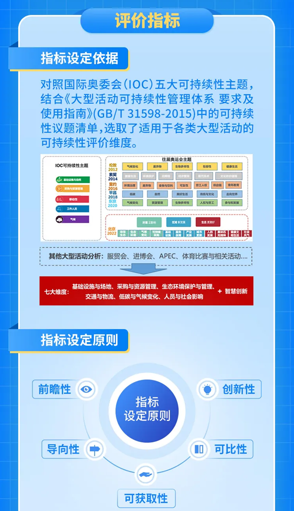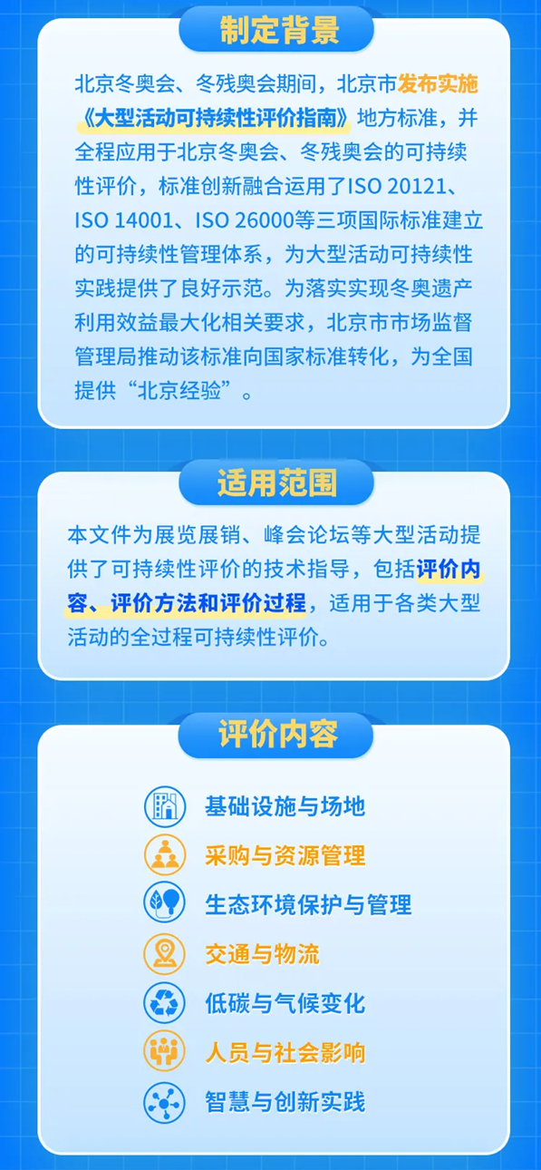 本标准着眼于绿色发展,对接联合国可持续发展目标(SDGs),围绕可持续性采购、碳中和、场地利用、生态修复和恢复等方面设置了7大类35项评价指标,重点关注大型活动的绿色低碳水平、对生态环境的保护、资源的合理利用以及社会责任承担。标准提供了科学的评价方法,将大型活动的可持续性分为强、中、弱三个等级,提出了指标分值计算、评价等级设定等,评价过程涵盖大型活动的申办、筹备和举办全过程。《大型活动可持续性评价指南》国家标准的发布实施,是落实联合国可持续发展目标的积极举措,有利于引导和促进我国城市和地区在组织大型活动时实现经济、社会和环境的协调发展,对推动实现城市可持续发展具有重要指导意义。