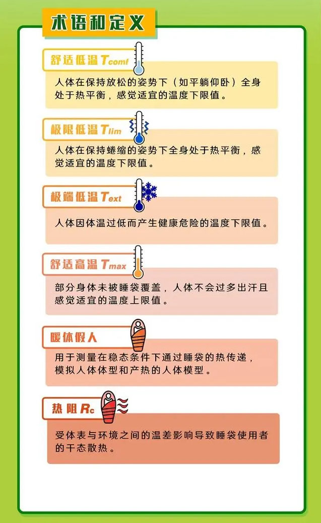 《睡袋的要求 第1部分》规定了睡袋热性能、尺寸和质量等指标的标签要求、技术要求和测试方法,描述了用于评价稳态条件下睡袋保暖性能的试验方法。《睡袋的要求 第2部分》基于睡袋保暖、舒适、便携,并在特殊使用环境下具备防水等性能的总体要求,对睡袋生产过程中所涉及的面料、里料、胆布、填充物等原材料提出了性能要求。