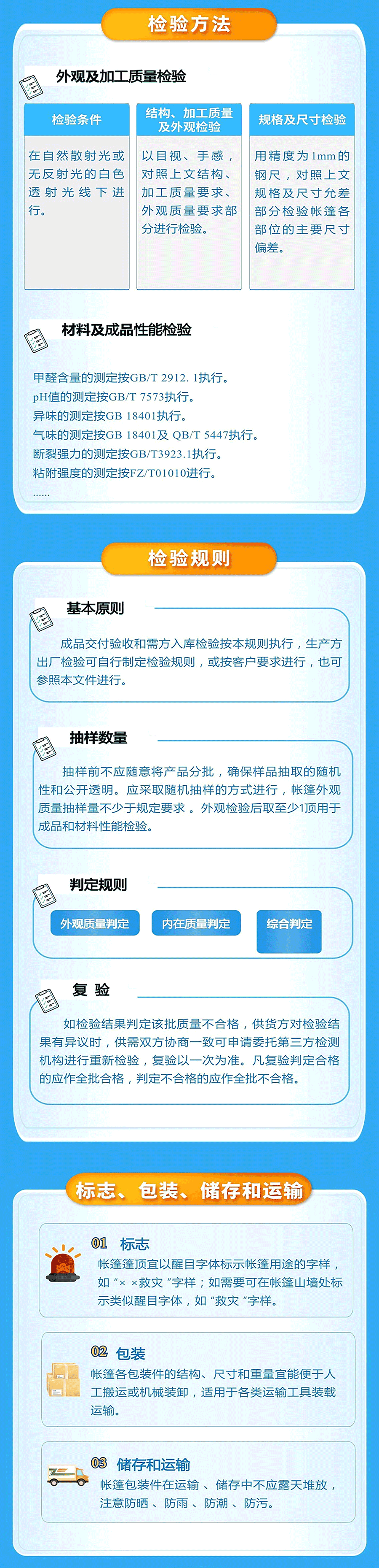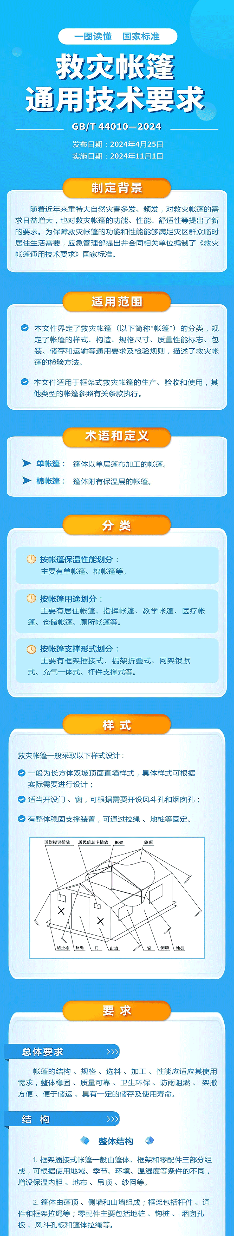 《救灾帐篷 通用技术要求》规定了救灾帐篷的分类、样式、构造、规格尺寸、质量性能、标志、包装、储存和运输等技术要求及检验方法,适用于框架式救灾帐篷的生产、验收和使用。该标准的发布实施,有助于统一全国救灾帐篷的生产技术要求和试验方法,提升救灾帐篷的产品质量,保障受灾人员得到更安全、更舒适的临时安置。