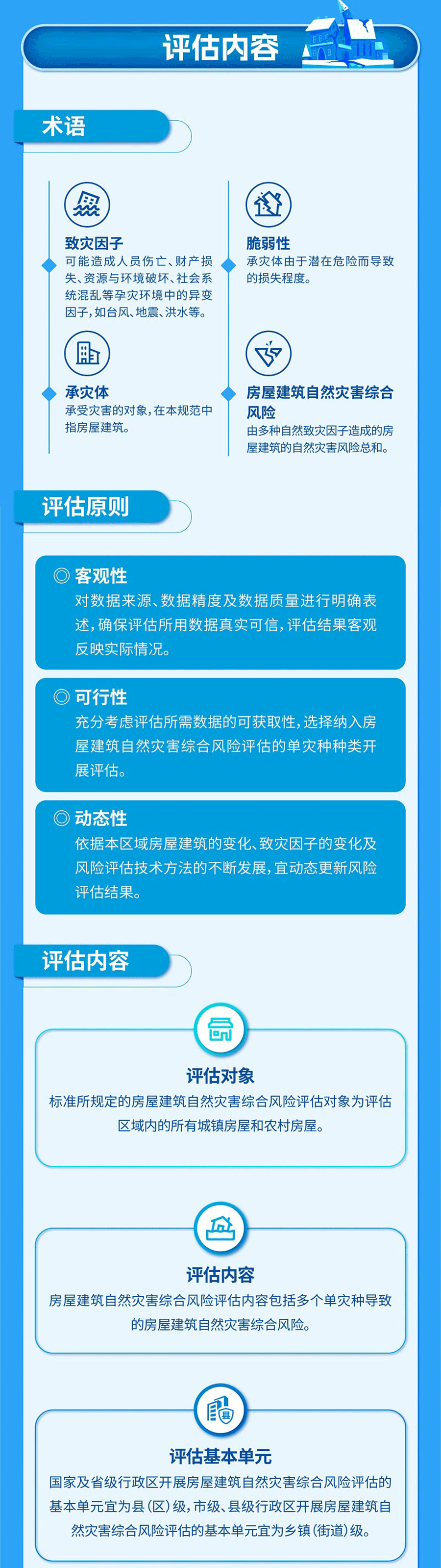 《自然灾害综合风险评估技术规范 第1部分:房屋建筑》规定了县级以上行政区域房屋建筑自然灾害综合风险评估的技术流程,规定了房屋建筑自然灾害综合风险评估的范围、对象、内容和基本单元,描述了评估数据准备与评估方法。该标准的发布实施,有助于提高我国房屋建筑综合风险评估工作的规范性和科学性,为房屋建筑风险治理工作提供技术支撑。