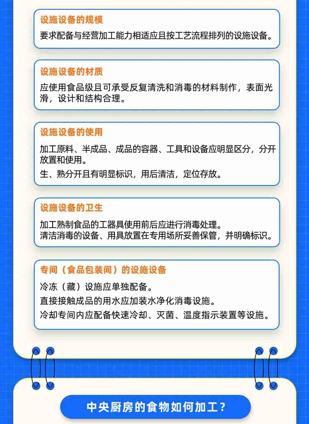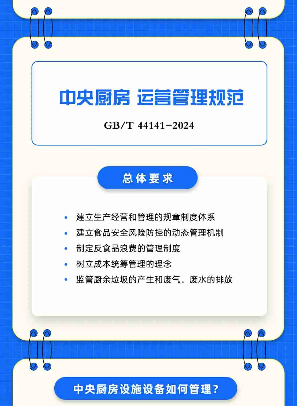 《中央厨房建设要求》给出了中央厨房选址与总体布局、加工区场所设置、主体建设、设施设备四个方面的要求,指导中央厨房合理建设、科学投资。《中央厨房 运营管理规范》则从设施设备管理、经营加工过程、安全与追溯、应急与召回、人员管理、信息记录与档案管理,以及监督、评价与改进等方面,为中央厨房的运营管理提供指导,并对原辅料采购与验收、经营加工、检验与留样、仓储、配送、交付等环节提出具体细化要求。