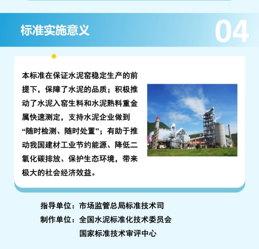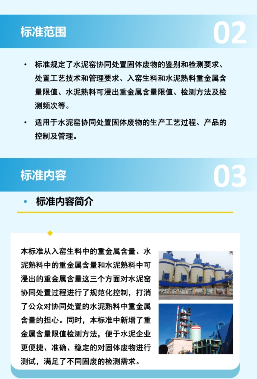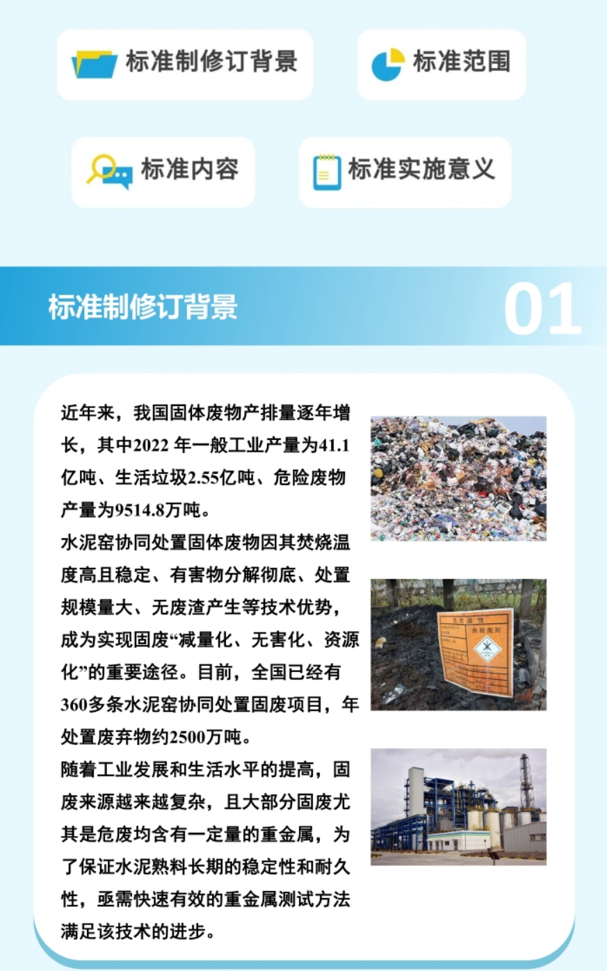 该标准在2014年版《水泥窑协同处置固体废物技术规范》的基础上进行修订。新版本从入窑生料中的重金属含量、水泥熟料中的重金属含量和水泥熟料中可浸出的重金属含量这三个方面,对水泥窑协同处置过程进行了规范化控制。同时,本标准中新增了重金属含量限值检测方法,便于水泥企业更便捷、准确、稳定的对固体废物进行测试,满足了不同固废的检测需求。本标准的发布和实施积极推动了水泥入窑生料和水泥熟料重金属快速测定,支持水泥企业做到“随时检测、随时处置”。