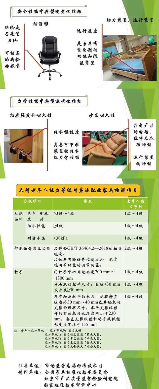该标准充分考虑老年人的身心变化和生活需求,根据不同老年人行为能力等级,对适配家具的理化性能、结构安全、智能语音交互功能等提出了相关要求和试验方法,适用于适老家具产品的设计、生产加工、质量检验、质量评定。标准的发布和实施,将指导家具企业设计生产更多符合老年人需求、舒适安全的适老家具产品,推动提升适老家具产品的质量安全水平和老年人使用体验感,有力促进适老家具行业健康发展。