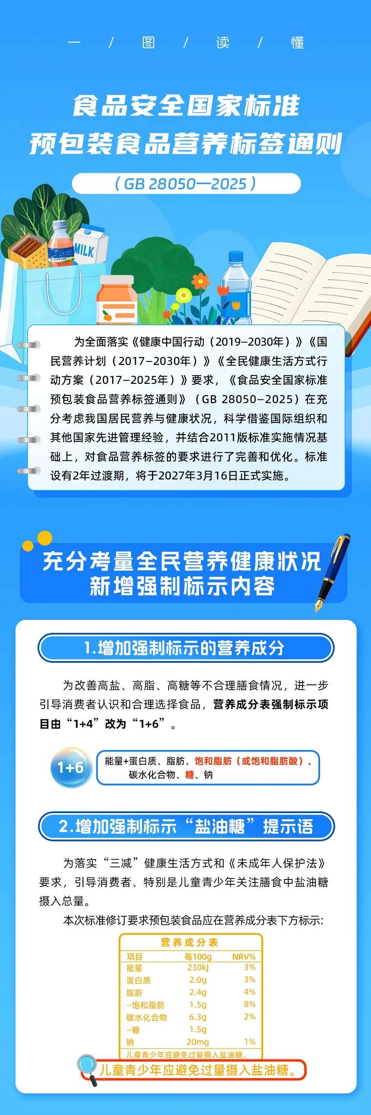 2025年3月27日,国家卫生健康委会同国家市场监督管理总局正式发布《食品安全国家标准 预包装食品营养标签通则》(GB 28050-2025),新修订的标准将替代《预包装食品营养标签通则》(GB28050—2011),并将于2027年3月16日起实施。