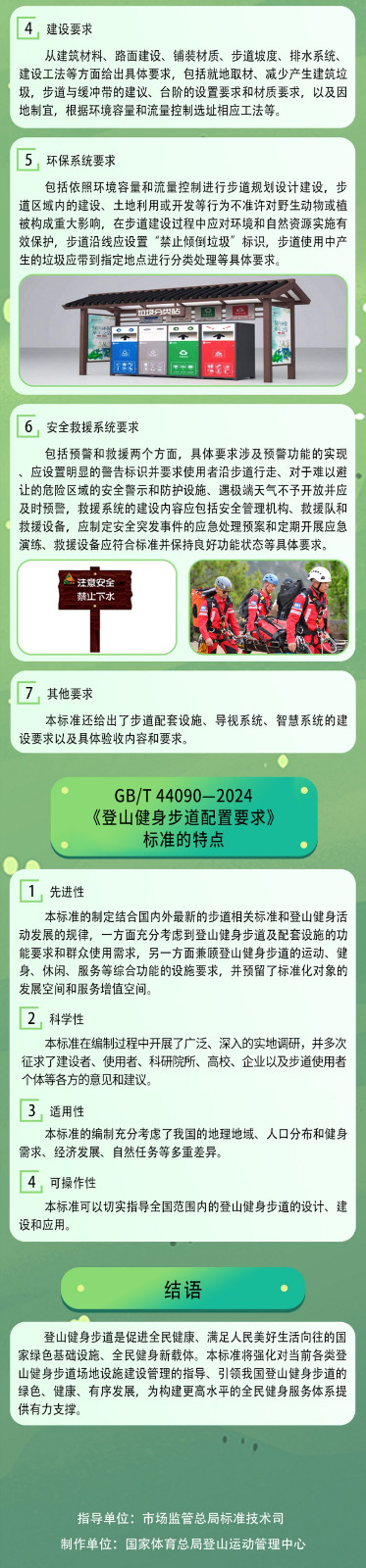 标准的发布和实施,将强化对当前各类登山健身步道场地设施建设管理的指导、引领我国登山健身步道的绿色、健康、有序发展,为构建更高水平的全民健身服务体系提供有力支撑。