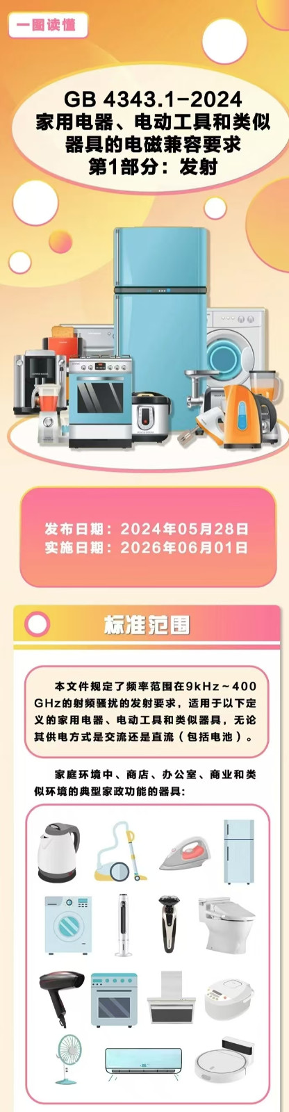 5月28日,国家市场监督管理总局(国家标准化管理委员会)修订发布了《家用电器、电动工具和类似器具的电磁兼容要求 第1部分:发射》(GB 4343.1—2024)强制性国家标准,将于2026年6月1日正式实施。