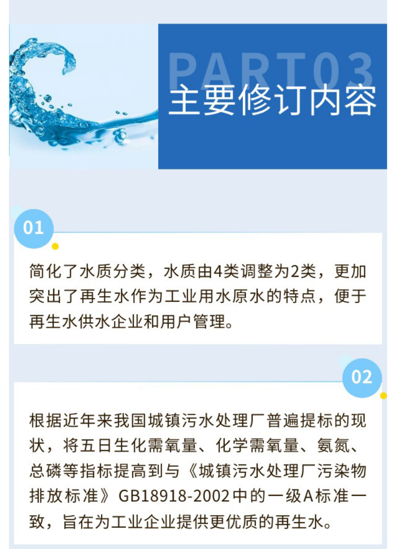 3月15日,国家市场监督管理总局(国家标准化管理委员会)修订发布了《城市污水再生利用 工业用水水质》(GB/T 19923—2024)推荐性国家标准,已于2024年10月1日正式实施。