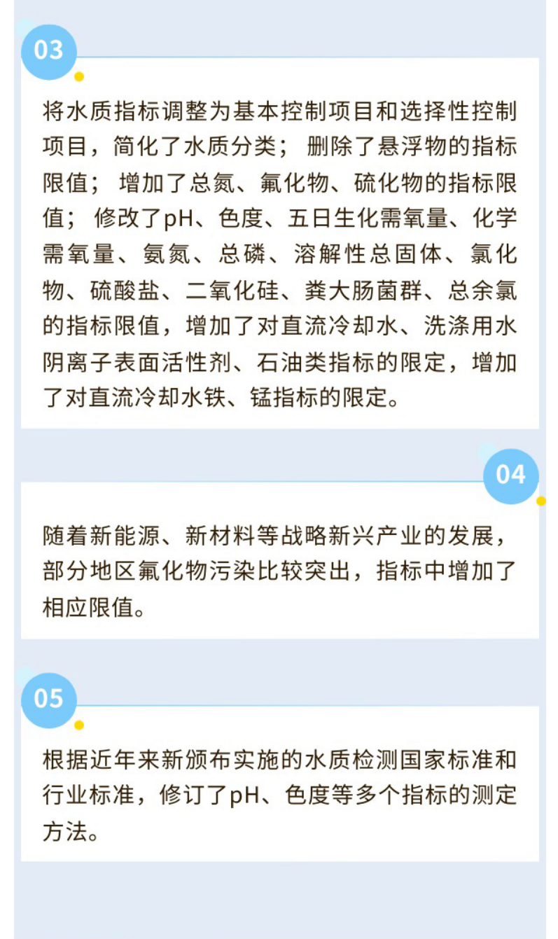 该标准在2005年版《城市污水再生利用 工业用水水质》的基础上进行修订。相较于旧标准,新版本将水质指标调整为基本控制项目和选择性控制项目,简化了水质分类;增加了氟化物限值;修订了pH、色度等多个指标的测定方法。