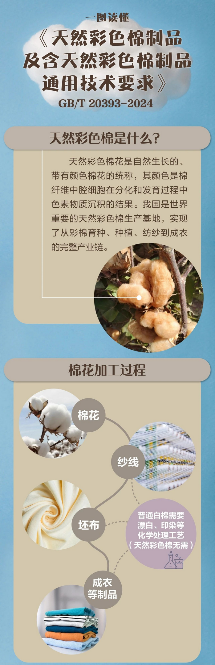 2024年10月1日,GB/T 20393-2024《天然彩色棉制品及含天然彩色棉制品通用技术要求》推荐性国家标准正式发布,已于同年10月1日正式实施。