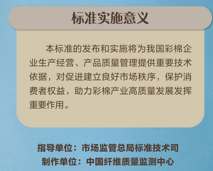 该标准的发布和实施将为我国彩棉企业生产经营、产品质量管理提供重要技术依据,对促进建立良好市场秩序,保护消费者权益,助力彩棉产业高质量发展发挥重要作用。
