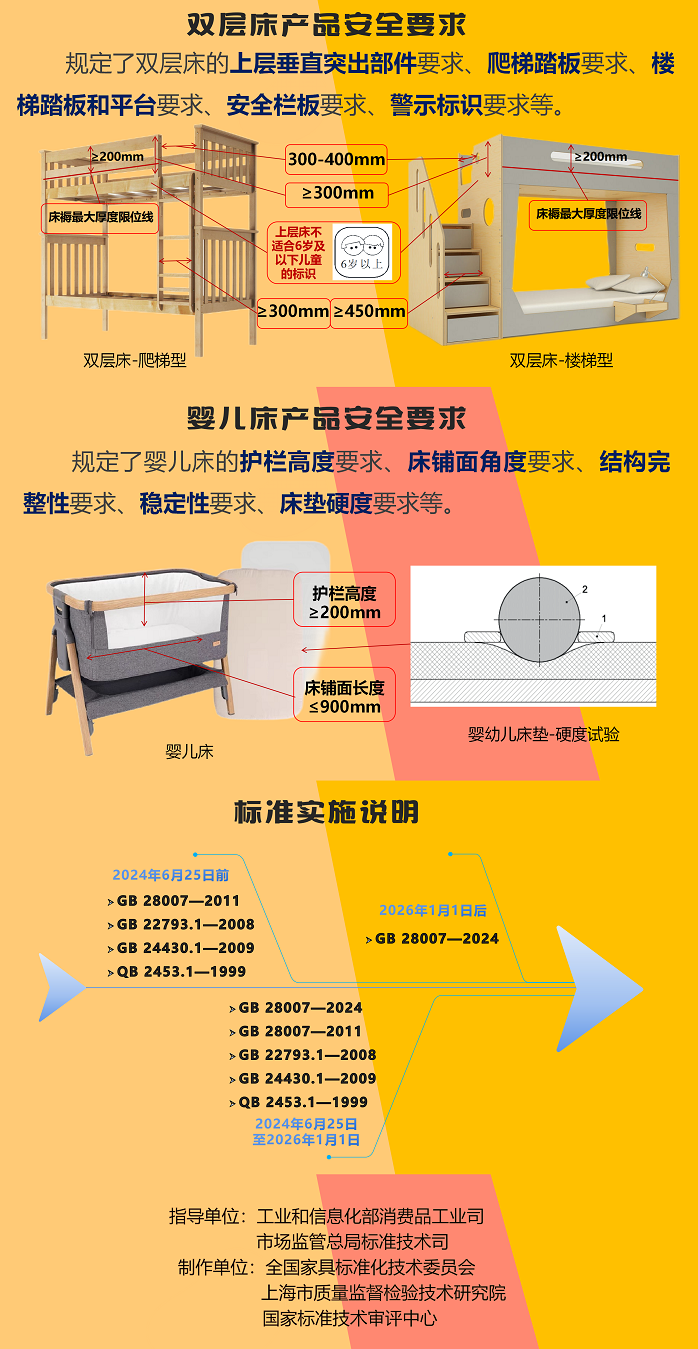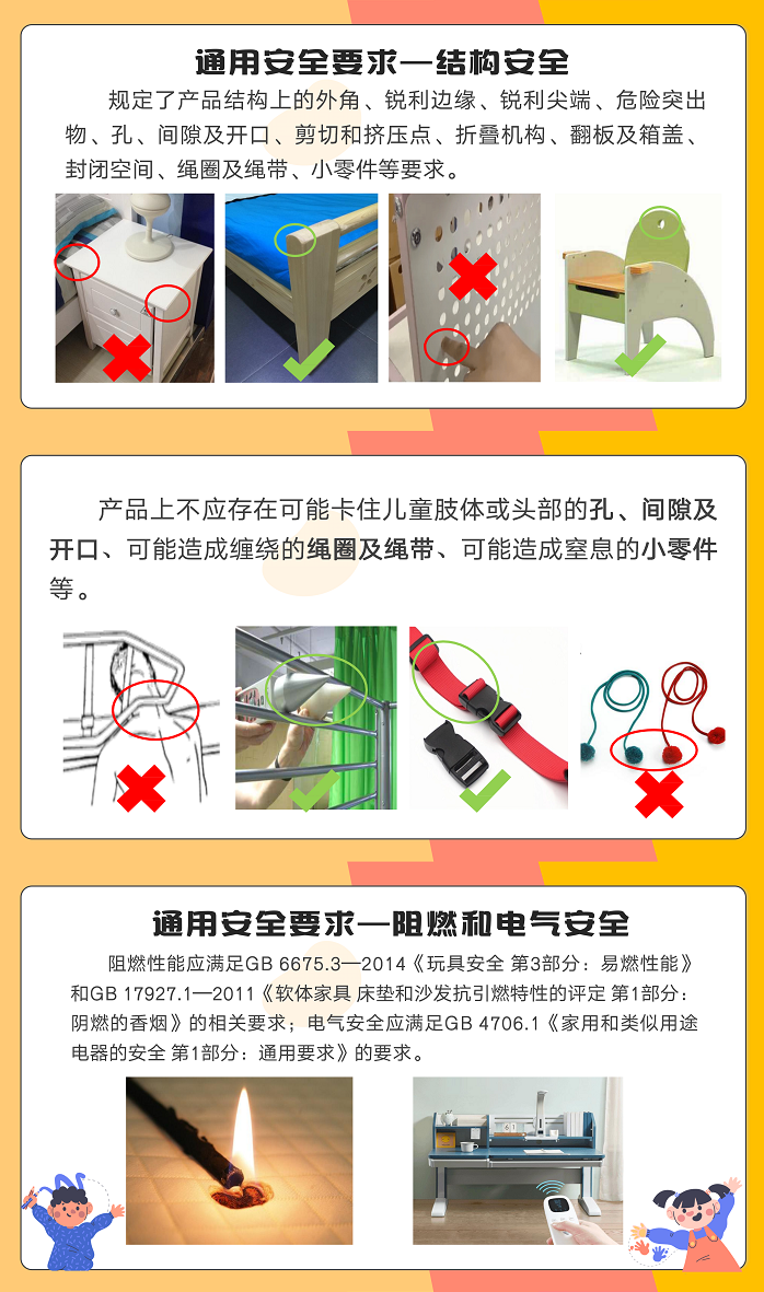 该标准在《儿童家具通用技术条件》(GB28007-2011)、《家具 儿童高椅 第1部分:安全要求》(GB22793.1-2008)、《家用双层床 安全第1部分:要求》(GB24430.1-2009)等标准的基础上进行整合修订。新标准适用于所有0岁至14岁婴幼儿及儿童家具产品质量安全的管控,规定了材料、结构、阻燃性能、电气安全、有害物质限量、警示标识等通用安全要求,以及儿童高椅、双层床/高床、童床和折叠小床、婴儿床、软体家具等特定产品安全要求和相应的试验验证方法。
