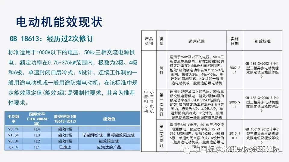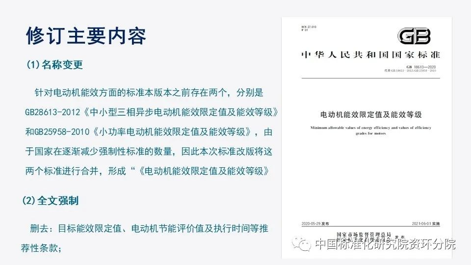 2020年6月1日,国家市场监督管理总局(国家标准化管理委员会)发布了《电动机能效限定值及能效等级》(GB 18613-2020)强制性国家标准。该标准修订整合了原强制性国家标准《中小型三相异步电动机能效限定值与能效等级》(GB 18613-2012)和《小功率电动机能效限定值与能效等级》(GB 25958-2010)2项强制性能效标准,并已于2021年6月1日实施。